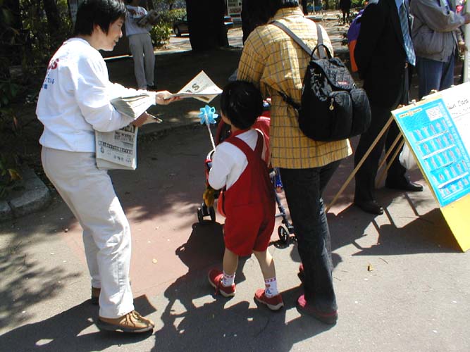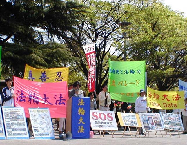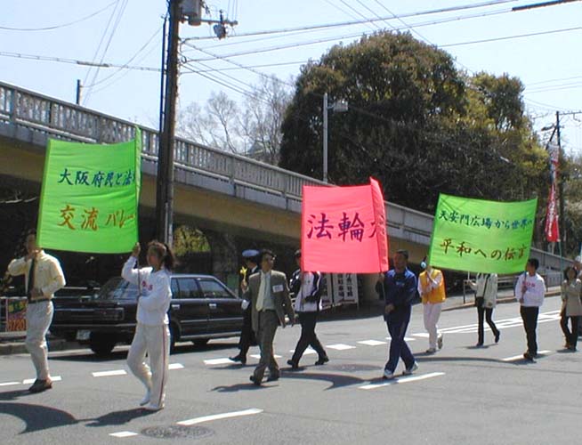 【明慧网2002年4月8日】为了进一步向日本人民揭露江泽民集团对法轮功的残酷迫害及在长春的疯狂报复,声援3月5日以来在长春被非法拘捕的五千多名大法弟子及大陆其他大法弟子,在京都游行之后,日本大法弟子5日又在大阪(Osaka)和6日在神户(Kobe)连续举行了游行,向日本各界人士讲清真相,呼吁共同制止江泽民集团对法轮功的无理迫害。