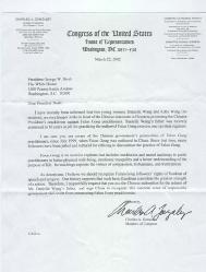 2002年3月22日,美国会议员查尔斯.冈萨雷斯先生就休士顿两位法轮功学员绝食请愿一事致信布什总统,希望总统力促中国江泽民政府停止迫害法轮功。