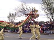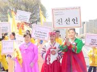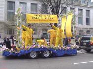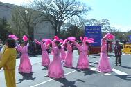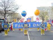 从上午8点左右开始,六、七十支游行队伍、数千人在美国国会山庄前的大草坪上集会,整列队伍。法轮功学员也纷纷搭好了花车、竖起了横幅,格外醒目。游行中,学员们随着优美的炼功音乐,边走边演示着动作舒展协调的功法,赢得了一路上数万观众的掌声。与往年不同的是,这次的游行增添了不少文化特色:来自加州的由学员自发组成的舞蹈队身着粉色衣裙,随着普度音乐翩翩起舞,格外引人注目,所到之处掌声不断。数十块用各国文字写着“真善忍”的小展板向世人展示了大法在世界几十个国家的洪传。一些女学员身着色彩缤纷的中国传统服装,韩裔、印度裔学员身着本国民族服装,吸引了众多观众争相要求合影并主动询问有关法轮功的情况、索要资料。队伍中更有舞龙表演,为人们带来喜庆和欢悦。学员们祥和的问候与慈悲的笑容,浸沁着人们的心灵,给人们带来了“佛光普照,礼义圆明”的震撼。观众们纷纷伸出大拇指:“你们真美好!”队伍行经主席台,主持人热情、全面地介绍了法轮功,观众们再次报以热烈的掌声。