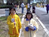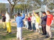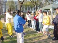 游行结束后,学员们在国会山庄大草坪上搭起帐篷和舞台,进行功法演示,并举行文化表演,大提琴独奏、民族舞蹈、舞龙等表演使樱花节更显得热闹非凡,吸引了众多游人驻足观望,并索要大法资料,有些游人当场学起了五套功法。早上才飞抵华盛顿的加州舞蹈队不顾旅途劳累,不仅立即参加了节日游行,还在下午的文化演出中为观众献上多台精心准备的舞蹈,其中一些更是以大法弟子在严酷迫害中的坚韧不屈、大善大忍为主题。在一旁解说的学员伴着舞蹈的情节变化,向观众们解释着大法的美好与江泽民迫害的邪恶本质。艺术的深刻表现力,淋漓尽致地把真相展现给人们。寒风未尽,但初春的阳光、大法的祥和慈悲却温暖着人们的心灵。