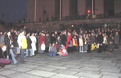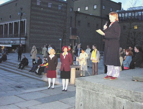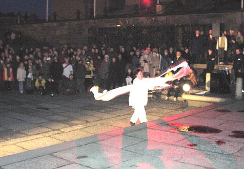 随着“普度”音乐,这位大法弟子翩翩起舞。她后面的背景是在播放的法轮功功法的表演录象。动人心旋的音乐、美丽祥和的背景和优美慈悲的舞姿感动了所有在场的观众。