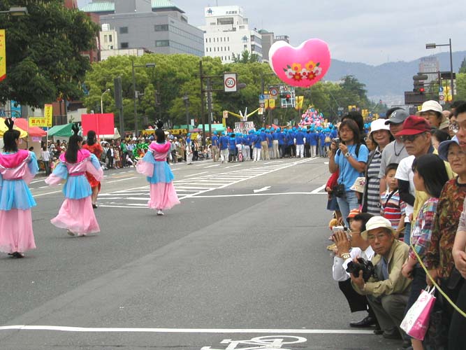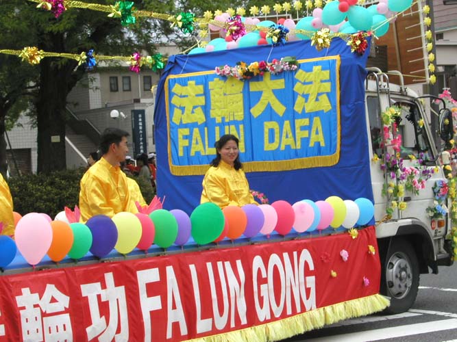 花车,飞天,秧歌队伍和黄色炼功服。来自日本南北各地的2百余名法轮功学员组成了这支亮丽出众的队伍。3天的花祭期间,法轮功学员将在百万游客的瞩目下展示法轮功的祥和美好风貌。美丽的彩车,轻盈的飞天,庄严的队伍,祥和的功法展示,引来路旁观众屏神观看。