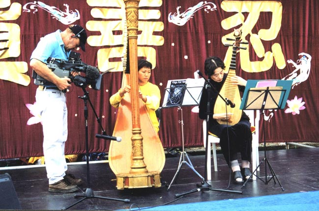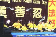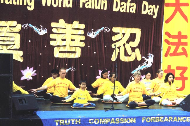 “真、善、忍”金光灿灿几个大字悬挂于舞台正中央,两侧是中英文“法轮大法好”和“法轮大法使你我受益”的黄色条幅。学员们身着洪法的黄T恤衫和节日服装展示了五套功法之后,有3位同修介绍了他们的修炼体会。学员们演唱了大法弟子创作的歌曲并演奏器乐。许多观众驻足观看,他们被同修体会中谈到的大法的神奇所吸引,为大法弟子精湛的表演赞叹不已。新西兰电视一台(国家电视台) 在前一天就以法轮大法为专题对我们进行了采访。庆祝活动中,他们的录像师又一直为我们拍摄。另一位记者前往基督城,采访了那里同期举行的法轮大法日庆祝活动。