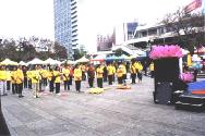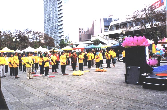 2002年5月11日来自哈密尔顿、罗托诺瓦、北帕的大法弟子和奥克兰的同修汇聚在奥克兰市中心的Aotea广场,共同庆祝第三届世界法轮大法日,庆祝师尊洪传大法10周年。