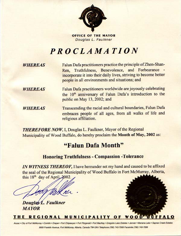 我,伍德水牛城(Wood Buffalo)自治市市长道格拉斯-法可纳,在此宣布2002年5月为