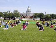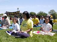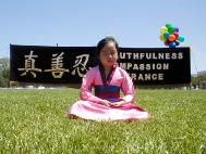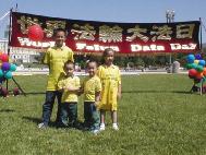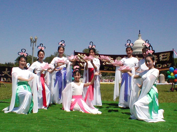 在整个活动中,除了炼功、发正念以外,还安排了丰富多彩的文娱节目,有中英文诗朗诵;小弟子电子琴独奏“如梦令”、“登归途”;小弟子背诵师父“法正人间预”,等等。其中,最为引人注目的是十多位学员参加的“舞龙”节目,和7位年轻女学员表演的“仙女舞”,只见她们身着雪白的中国古典传统仕女服装,在音乐的衬托之下,迎风起舞,真有一种“我欲乘风归去”、飘飘若仙的感觉,吸引了诸多游客和阵阵掌声。