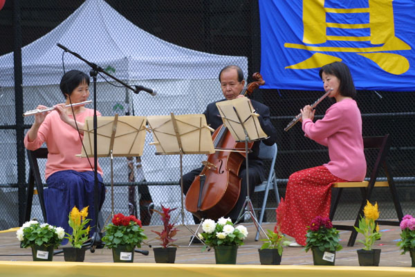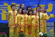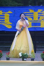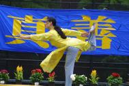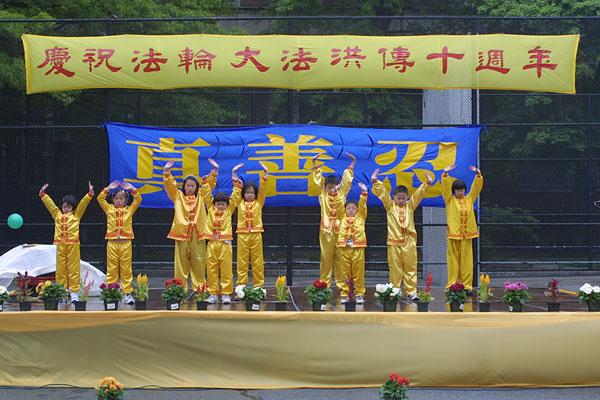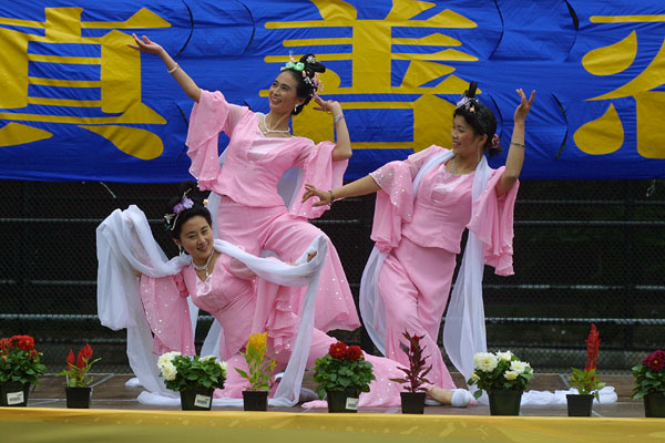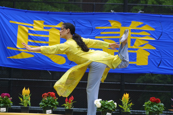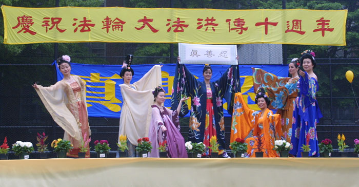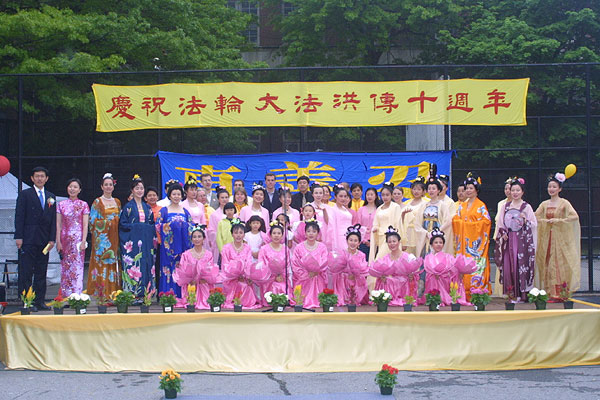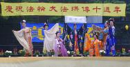 庆祝会上学员们还演出了自己编导的文艺节目,并作了法轮功的功法演示。这场文艺演出包括了舞狮、舞蹈、鼓乐、长笛大提琴三重奏、配乐诗朗诵、独唱、小合唱、大合唱及古装服饰表演等十九个节目,历时三个多小时。所有节目都是学员自编、自导、自演的,而且仅仅用了不到两、三个星期的时间排练、准备。每个节目都具相当的水准,因为学员们都是在用心、用自己的亲身体验来表演,真切地展现出“法轮大法好”,在观众的心中产生了强大的共鸣。