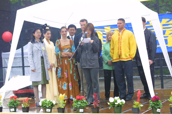 清晨,身着节日盛装和炼功服的法轮功学员从纽约市五大区和康州、新泽西州、费城汇集到纽约中国城——法拉盛,举行今天的庆祝活动。上午十点三十分,二百名法轮功学员冒着绵绵春雨,在法拉盛的主要街道缅街、罗斯福大道、联合大街进行庆祝游行,他们手执“法轮大法好”的彩色横幅,擎着五彩缤纷的气球,在《法轮大法好》的乐曲声中行进,有身穿黄色炼功服的,还有许多女学员身着“飞天”彩衣,宛若天女下凡,引得人们啧啧称奇。节日的气氛感染了人们,纷纷友好地向学员们索取资料。