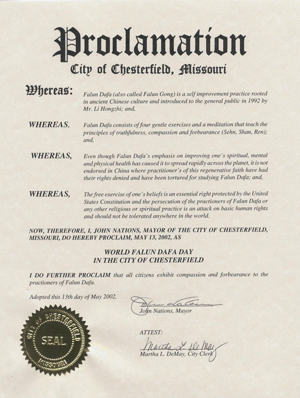 鉴此,我,约翰.内森,密苏里州切斯特菲尔市(Chesterfield) 市长, 特此宣布2002年5月13日为切斯特菲尔市