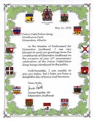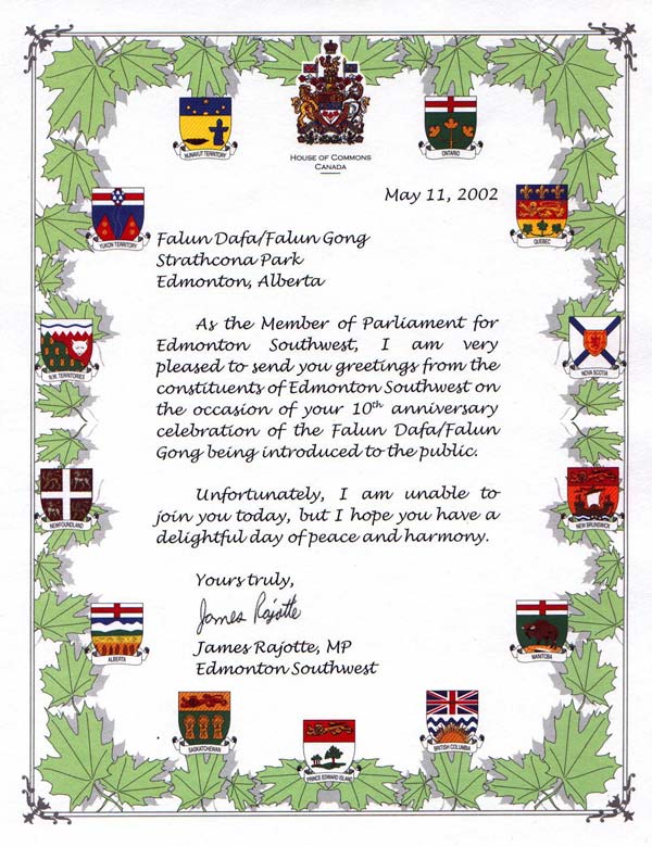 作为埃德蒙顿西南区的国会议员,值此庆祝法轮大法/法轮功洪传于世十周年之际,我非常高兴地代表埃德蒙顿西南选区的选民们向你们表示祝贺。