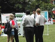 庆祝活动之初,层层叠叠的乌云夹着狂风滚滚而来。学员们不为所动,发正念,铲除另外空间破坏大法的一切邪恶。而后,乌云渐渐散去,凉风习习。有缘人络绎不绝地来到这里,索取资料,跟着台上的学员炼起了优美的功法;听学员用民乐笛子吹奏的《九双鞋》,行人为之驻足,在场的人都真切地感受到了那一种浩然正气,直冲云霄;九位身穿白色长裙的女学员唱起了《登归途》,《得度》,《法轮大法好》,那用心谱写和演唱的歌曲,向芸芸众生传达着大法无限的慈悲和无以伦比的美好;两位女大法弟子在“悠悠万古魂”的乐声中,舞起了彩扇,彩绸,犹如飞天凌空,天女下凡,在她们脸上闪烁着动人的纯真和喜悦,是啊,这对大法弟子来讲,是殊胜普天同庆的日子,方寸舞台,表达了众弟子对师尊十年慈悲苦度的感激和助师正法的决心。