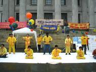 在中国城的庆祝活动遇到了邪恶的严重干扰。在游行队伍出发时,队伍中混进了几个动机不明的人,被学员劝了出去。当游行队伍经过中国城中心的一个街角时,有一伙不明来路的人高喊污蔑法轮大法的口号。这时,乌云密布,下起一阵瓢泼大雨。学员们不为所动,齐发正念,清除邪恶。雨渐渐变小了。后来,这一伙人又继续在学员举行文艺演出的哥伦布公园长时间鼓噪捣乱。在随后的半小时内,天空下起倾盆大雨。学员们先炼功,然后就像一尊尊顶天立地的神,长时间站立在暴雨中发正念,雨势渐渐转小。这时那伙来骚扰的人销声匿迹。一些学员继续发正念,一心坚定除恶,并不因这个空间中是否雨停而受影响。学员们在小雨中坚持演完了自己编导的文艺节目。一些维持秩序的警察为学员坚韧不拔的精神感动。