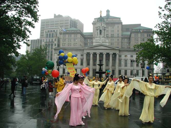 然后,学员们高举彩色横幅、五彩缤纷的气球擎起的“世界法轮大法日”竖幅,手执“Falun Dafa”和美国国旗的三角彩旗,敲锣打鼓,声势浩大地穿越下城闹市区向纽约中国城进发。一路上,许多华人都接过了学员递上的资料。有的摊贩还将“Falun Dafa”的三角彩旗插在门口的货架上表示对法轮大法的支持。在经过中国城街道时,学员用普通话和粤语向华人广播法轮大法的起源、发展和良好的社会效益,同时也揭示了三年来中国江泽民集团的无理镇压。伴随游行队伍,有一辆大型广告车展示“世界法轮大法日”的巨幅广告,上面学员在公园草地上打坐炼功,为游行增添了气氛,引起路人的赞叹。