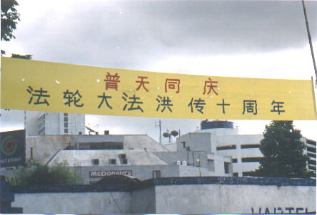 活动过程中,也遇到邪恶的干扰,由于大家正念强,邪恶没能达到目的,洪法庆祝活动照常进行。震撼最大的是拉横幅。因历史原因,在印尼已经有30年没有人敢公开在街上出现中文。当“法轮大法好”,“真善忍”,及一条7米长的“普天同庆法轮大法洪传十周年”的横幅在泗水最热闹的中心大街最显眼的高处展现,为期三天时,引起极大的震动。这是大法的威德,取得极好的社会效果。