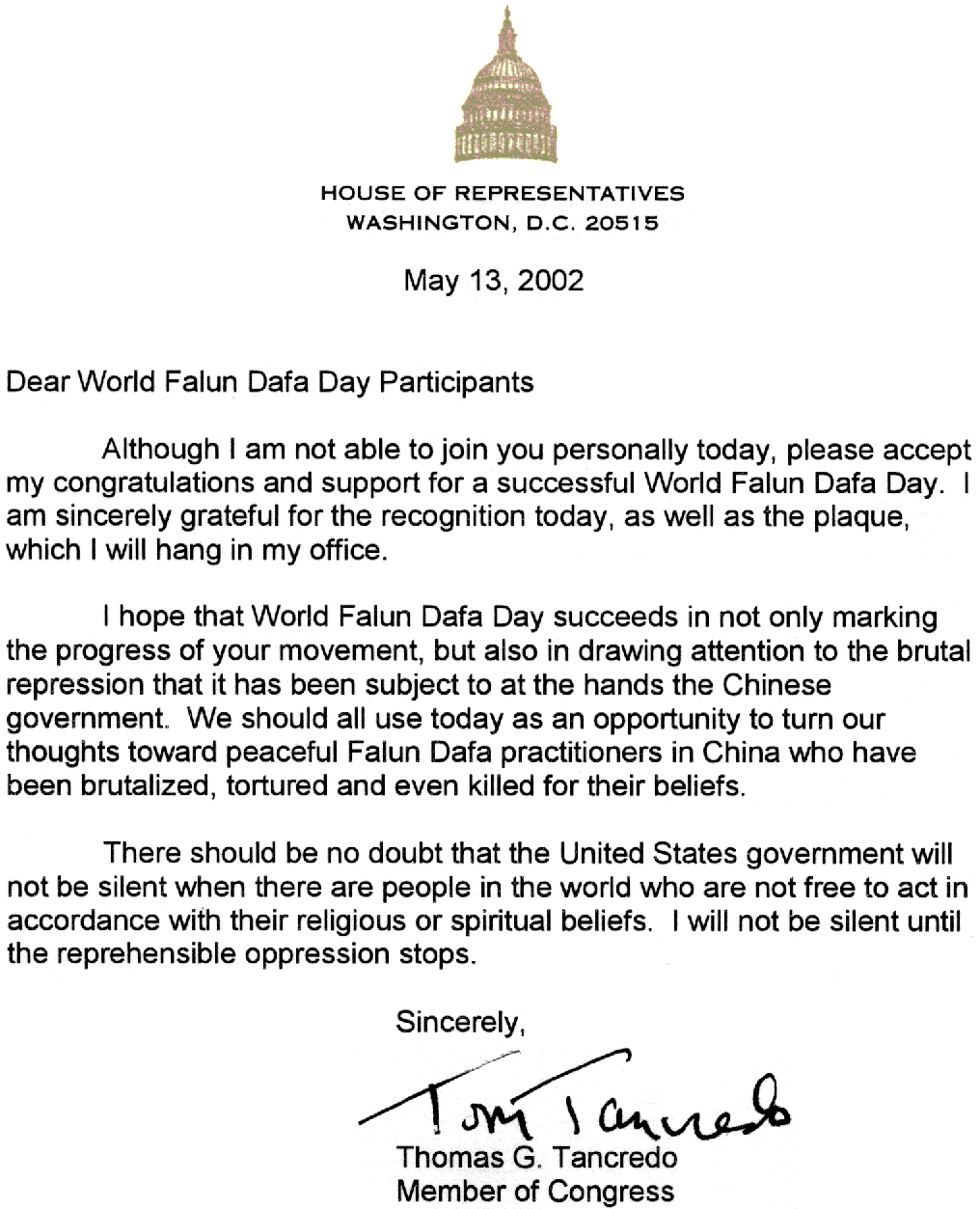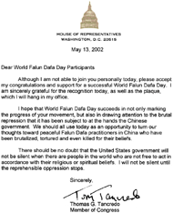我希望世界法轮大法日不仅能成功地庆祝你们的运动取得进展,同时也能唤起公众对中国(江泽民)政府统治下残暴镇压法轮功的关注。我们应当借此机会遥念在中国的法轮大法学员。他们因为自己的信仰遭到[江泽民政权]的残酷摧残、折磨,乃至虐杀。