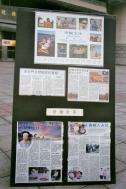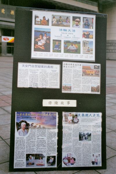 天安门自焚疑案的真相及法轮功学员为什么要去天安门,这一面展板则回答了民众常会想了解的问题。台湾学员修炼心得故事主题则述说着学员学炼大法的缘起及修炼前后身心的极大变化。(图二)