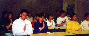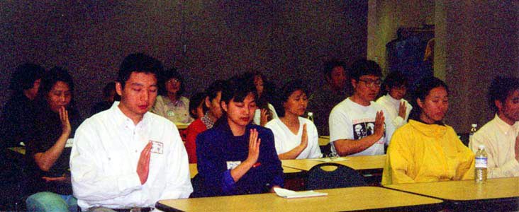 【明慧网2002年5月16日】2002年5月12日,为迎接法轮大法洪传十周年及世界法轮大法日的到来,堪萨斯城及邻近城市哥伦比亚市和曼哈顿市的大法弟子,在堪萨斯城召开了首次法轮大法修炼心得交流会。会场气氛庄重祥和,四周墙壁上挂有中英文的“真,善,忍”,“法轮大法”及“世界法轮大法日”的横幅,师尊的法像高高悬挂在会场中央,在弟子们敬献的鲜花之中。