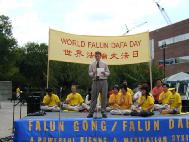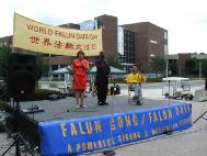 正午12点,庆祝仪式正式开始,法轮大法学生俱乐部主席首先了介绍世界法轮大法日的特别意义,并邀请大家一同静默一分钟向以生命捍卫真善忍的中国法轮功学员致敬,学员们同时发正念。之后,大赦国际的女发言人发言并倡议每个人都行动起来帮助停止镇压。