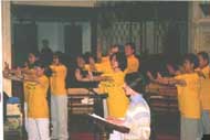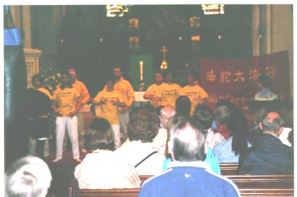 伴着优美祥和的大法音乐,8位大法弟子身着印有法轮大法的黄色T恤衫在台上整齐地表演五套功法,后面的两位弟子高举“法轮大法好”的横幅,一位俄罗斯籍的大法弟子用英文解说。短短的10分钟时间,时间仿佛凝固了。纯正祥和的能量场感染了在场的每一个人,使在场的观众感受到大法的殊胜和美好。场下观众对表演报以热烈持久的掌声。
