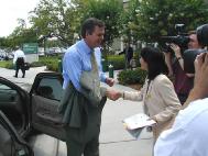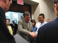 向布什州长介绍情况在退场时,我们主动同执行州长富兰克.布罗根交谈,并更深入的介绍了法轮功在中国国内外遭迫害的情况,他接受了大法资料并对学员们的遭遇深表同情,他祝我们好运并欣然同我们合影留念。