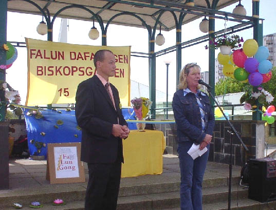 | 瑞典法轮大法协会代表向区政府致谢 | 学员代表介绍修炼法轮大法的益处 |