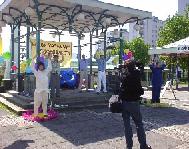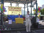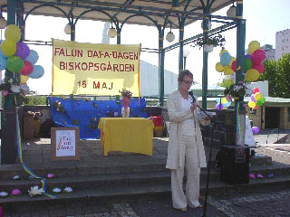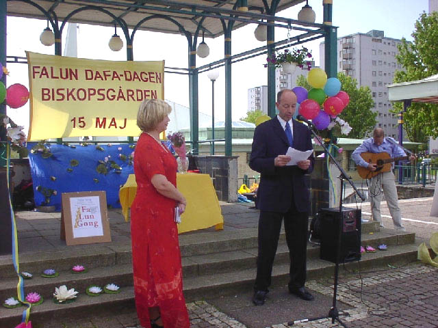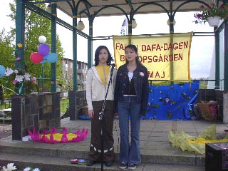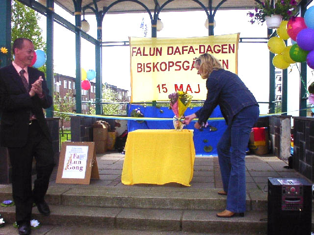 【明慧网2002年5月19日】5月15日,瑞典迎来了第一个法轮大法日。哥德堡市比斯哥园区(Biskopsgården)显得格外热闹,区广场的讲台被彩色气球和花朵装扮得很漂亮。讲台的中间挂着一个醒目的横幅:“比斯哥园区的法轮大法日,5月15日”。该区政府向市民宣布每年的5月15日为该区的法轮大法日并在该区的中心广场为该日的创立举行了剪彩仪式。