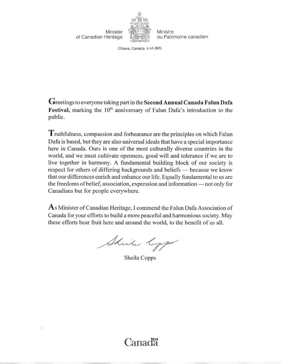 作为加拿大文化承传部部长,我对加拿大法轮大法协会为建立一个更和平、更融洽的社会所付出的努力表示赞赏,希望这些努力在加拿大以及全世界开花结果,造福全人类。