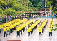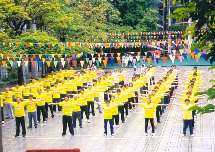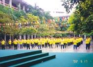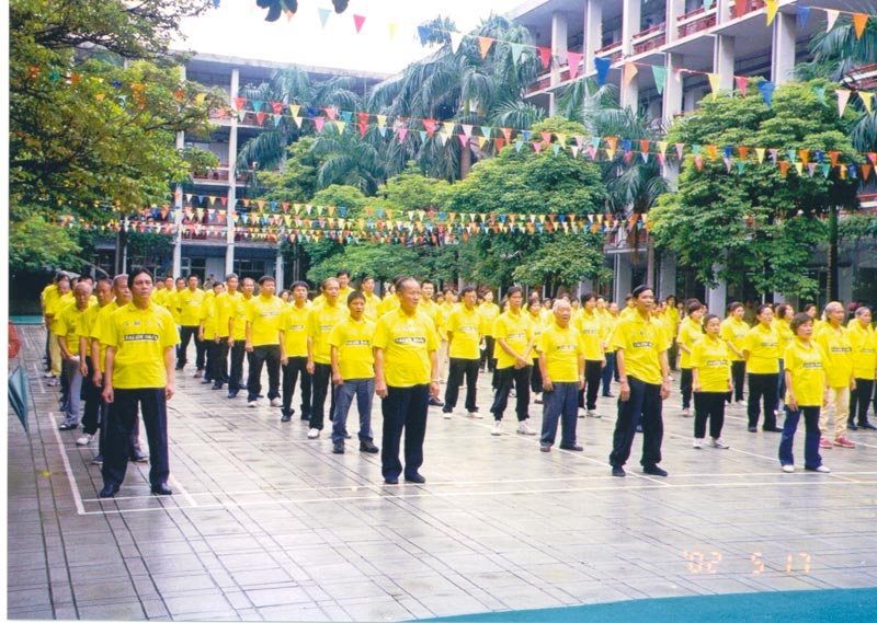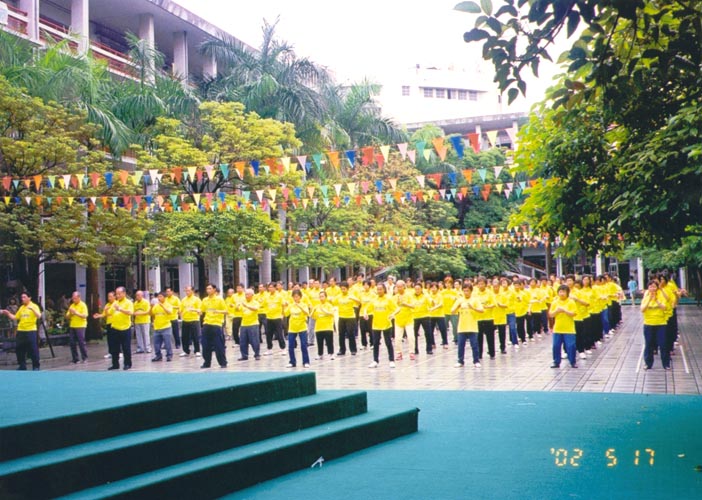 五月十七日(星期五)一大早就一直阴雨不断,真令人心中不快,跟着到了九点左右,学校陆续宣布停止教职员工的趣味竞赛以及学生的班际2000公尺的大队接力比赛,这个情势似乎很不妙,当天预定在上午十一点到十一点半举行三十分钟的功法表演。到了十点,学员们陆陆续续的进入了校门,并已在校园内洪法、发传单、讲清真相,十点半左右,学员已超过了百人,大家先在礼堂中放置随身物品,并做休息与准备,此时大家一致决定风雨无阻的进行本次的活动。到了十点四十五分开始整队进入会场,十一点开始准时功法表演,此时虽然阴雨依旧,却已小了许多,唯一遗憾的是录音机却出了状况,在不断的毁损录音带及更换录音机及录音带之下,总算度过了这一关,结束时却也耽误了十分钟之多。这是我们正念的不足所致,一定要向内去找。值得一提的是,学员们情绪并未受影响,此情况一致获得在场教职员工们的赞叹与惊讶。