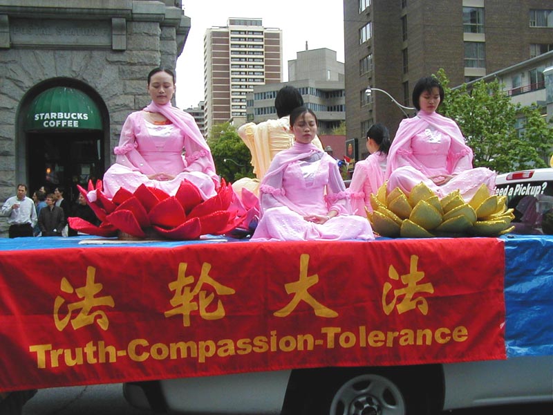 路边,围观的人们兴高采烈的观赏和品评着游行的队伍。在热烈和喧闹声中, “法轮大法好”的美妙音乐、喜悦祥和的法轮功学员的游行队伍为人们带来了惊喜。有白色、蓝色、黄色组成了几个不同的方阵,加拿大国旗,与“法轮大法在加拿大”的横幅遥相辉映。彩车上的仙女和扇子舞、彩带舞得到了观众的喝彩和掌声。色彩缤纷的竖幅法轮旗和真善忍的三角旗组成了小型方阵,显现出庄重与威严。可以看到一些华人看到这样的场面时,先是睁大了眼睛,脸上显出吃惊和受震撼的神色,旋即面容上浮现出明快的笑容。在佛光普照下,人心正在改变着。