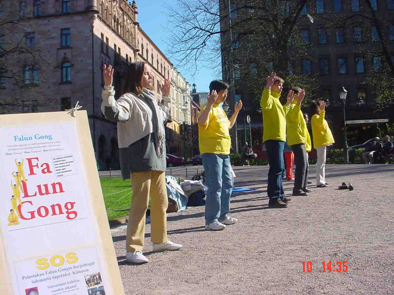 游行过后,学员们向观众介绍大法。一位芬兰学员首先致词,介绍美好的法轮功修炼实质并解释在中国(江泽民)迫害法轮功的背后原因,然后代表全世界法轮功学员呼吁善良的芬兰人民帮助制止这场迫害并为世界创造一个更美好的环境。另一位芬兰学员分享了自己的感人经历,讲述了修炼法轮功给人带来的身心巨大益处。
