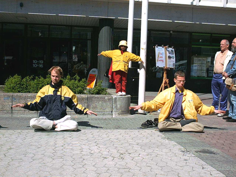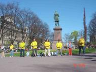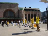 活动以星期五在该城市中的三个主要场所向公众介绍法轮大法为开端。这是一个美丽的日子,阳光明媚,万里无云,所以很多市民都走出家门享受这美好的春天。在6个小时里,赫尔辛基的人们有机会看到法轮功的功法,收到法轮功的资料传单,并从大型展板上了解到了更多有关法轮大法的信息。来自不同报社的记者们采访了学员并报导了这次活动。他们带着很大的兴趣与不同的学员讨论他们的经历体会。