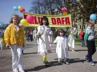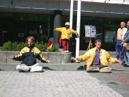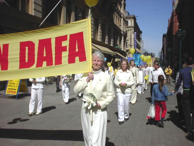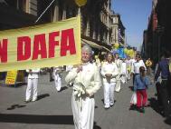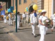 星期六的天气还象前一天一样好,对在市区的法轮大法游行来说非常理想。身穿白色和黄色衣服的学员们举着多彩的横幅、气球和小旗子游行,场面令人感动。很多行人观看游行队伍走过。一位意大利男士在学员们准备游行的时候就注意到了,并想要加入活动,结果他全天都与学员们在一起,沉浸在祥和的气氛中。游行队伍穿过市区一些很繁忙的街道,把法轮大法的美好展现给人们。