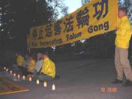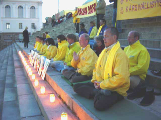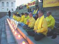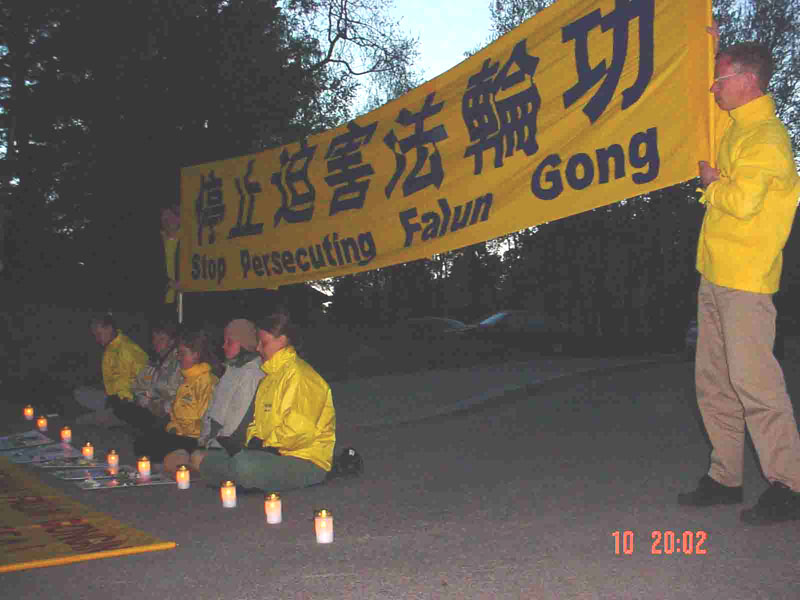星期五晚上,学员们在两个不同地点,中国大使馆和位于赫尔辛基市中心的主要教堂,为在中国遭受迫害的法轮功学员们举行了一次烛光守夜活动。在中国大使馆,一位职员甚至走出使馆拿了一份介绍中国大陆情况的中文真相资料。