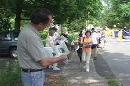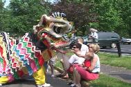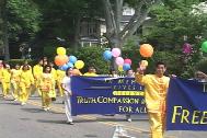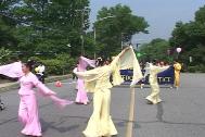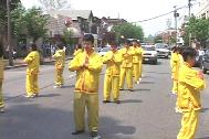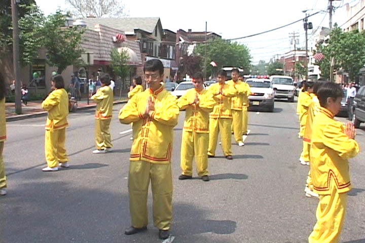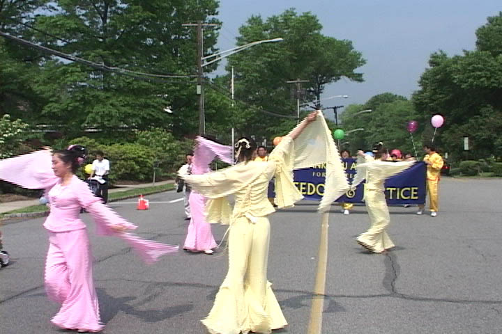 游行开始后,来自纽约的法轮功学员舞着狮子走在游行队伍的前面,学员们精湛的表演吸引了街两旁的观众。接着是四名身着仙女服装的女学员,随着“普度”音乐翩翩起舞。最后是近二十名身穿金黄色炼功服的学员,他们不时地为观众表演功法,博得了一阵又一阵的掌声。学员们游行所到之处无不受到市民们的热烈欢迎,许多华人居民也向学员们频频招手致意或鼓掌表示欢迎。另外还有几位学员一路向街两旁的市民发介绍法轮功的小册子和揭露中国政府镇压法轮功的英文报纸。不少市民对中国政府镇压法轮功的罪恶行径表示愤慨,另有些市民看了学员的功法表演后表示要到炼功点来学功。