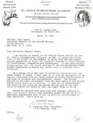 我代表圣琼安国际联盟(一非政府组织)美国分部向您写信,要求您关注因信仰真善忍而被中国(江泽民集团)镇压的法轮功学员们的艰难处境。我们对最近在日内瓦召开的联合国人权大会未能考虑他们的处境而失望。