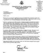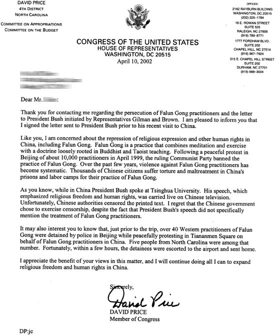 谢谢您就法轮功学员[在中国]遭受(江泽民集团)迫害以及由吉尔曼和布朗两议员发起致布什总统的信与我联系。我很高兴地告诉您,我在这封于布什总统访华前送交的信上签了字。