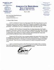 在中国,千千万万勇敢的法轮功修炼者冒着生命的危险,抵抗剥夺了他们基本的民主原则的[江泽民]政府。作为美国人民,我们当然钦佩这种抵制一个残酷的政府并为被压迫者疾呼的精神。这些信念应该受到全世界热爱自由的人们钦佩。