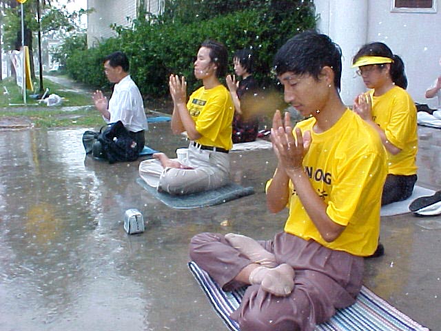 这里,白天有着接近华氏一百度的高温和骄阳,夜晚有毒蚁和蚊虫的骚扰,有时还有暴雨的袭击,但大法弟子们正念坚定,岿然不动,任凭惊雷在头顶翻滚,在暴雨中持续立掌一个多小时。这时他们只有最纯净的心态和最坚定的正念,而在另一空间,无数天神天将助阵,无比壮观,邪恶已无残喘之机。