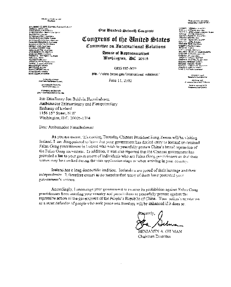 如你所知,本星期二中国国家主席江XX将访问冰岛。我很失望地获悉贵国政府禁止法轮功学员入境,并扣留了已在境内的学员。这些法轮功学员希望能和平地抗议中国[江氏集团]对该运动的残酷镇压。另外,也有报导说中国[江氏]政府已向贵政府提供了一份法轮功学员的名单,以便在签证申请阶段或入境时核对名字。