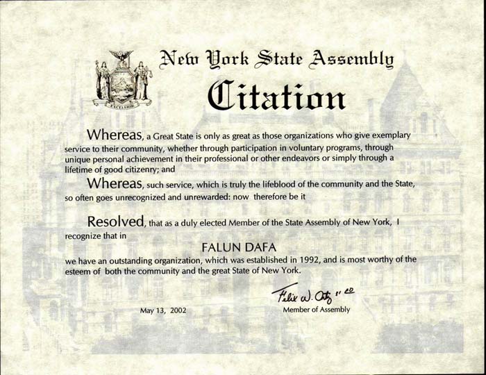 我们拥有一个杰出的团体 - 法轮大法。他建立于1992年,是最值得本社区和伟大的纽约州敬重的群体。