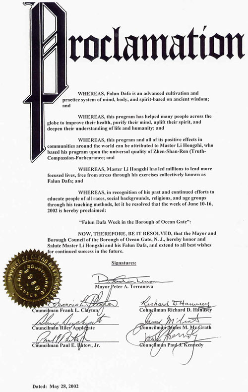 鉴于,为了表彰李洪志大师为教育各种族、各社会背景、各宗教信仰和各年龄层人士所付出的不懈的努力,特决定宣布2002年6月10日至16日为大洋门市(Ocean Gate Borough)“法轮大法周”。