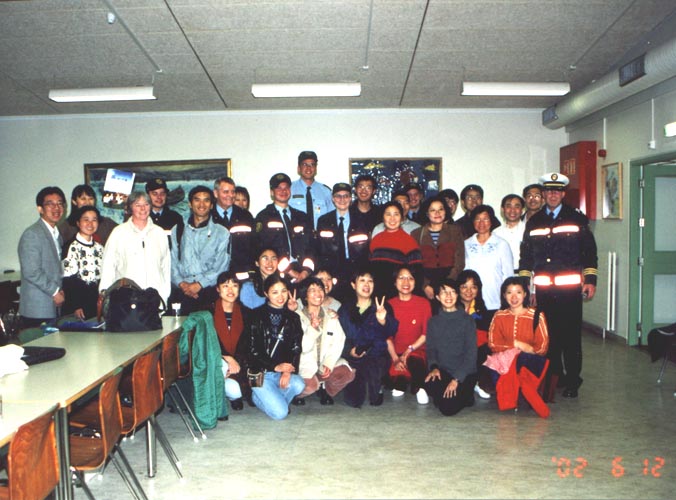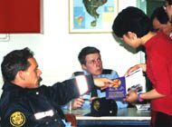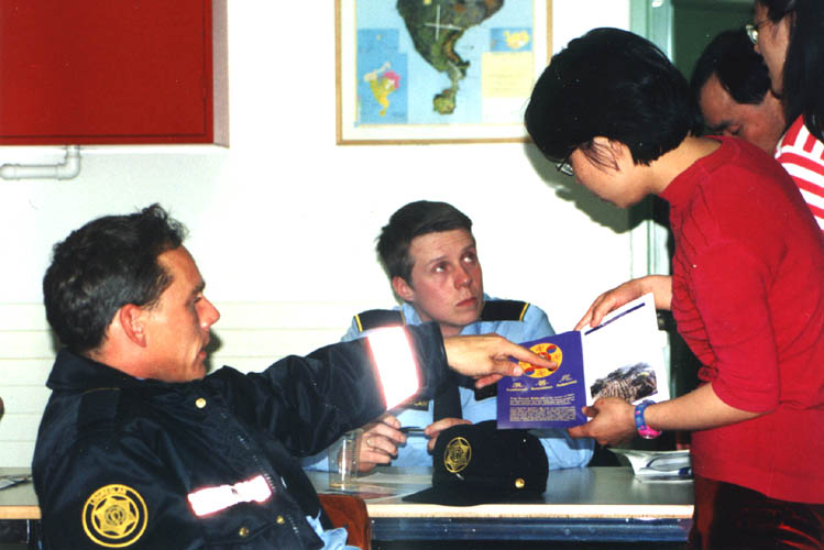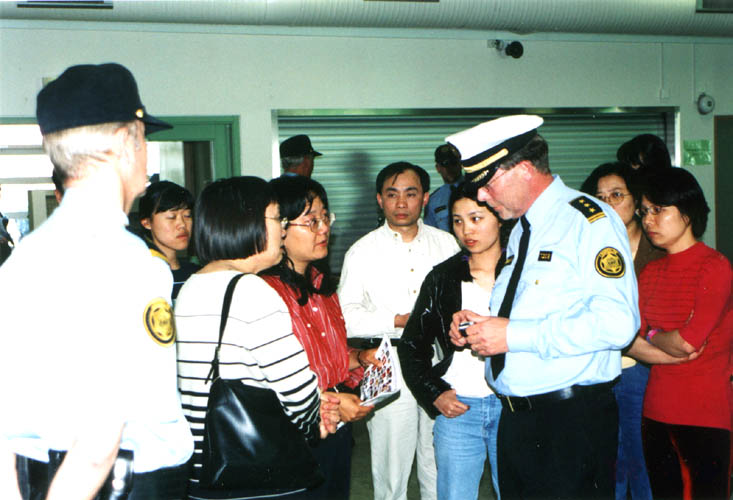 | 弟子们拿着被迫害致死的大陆同修的照片,含泪向警长讲真相。 | 在弟子们到达冰岛之前,邪恶已经向冰岛警察散发了诬蔑法轮功的黑材料,学员们凭着正念和慈悲,耐心地向警察讲真相,所有警察都转变了态度,许多警察在换班回家之前向学员索取大法真相资料。 |