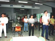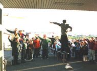 | 来采访的记者看到学员们正在炼功,顾不上采访,先学起功来。前排站的西人面孔者为记者。 | 弟子向来声援的冰岛民众发法轮功真相光盘。只见众生翘首以待,那渴望的眼神像等了几万年,场面感人。 |