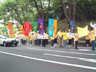 下午一点半,洪法游行开始,学员们举着横幅,排着整齐的队伍,显得格外祥和与肃穆。沿途散发着大法的资料,放送着“普度、济世”音乐,路人停下了脚步,静静地观看着我们的游行。