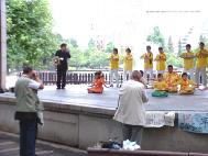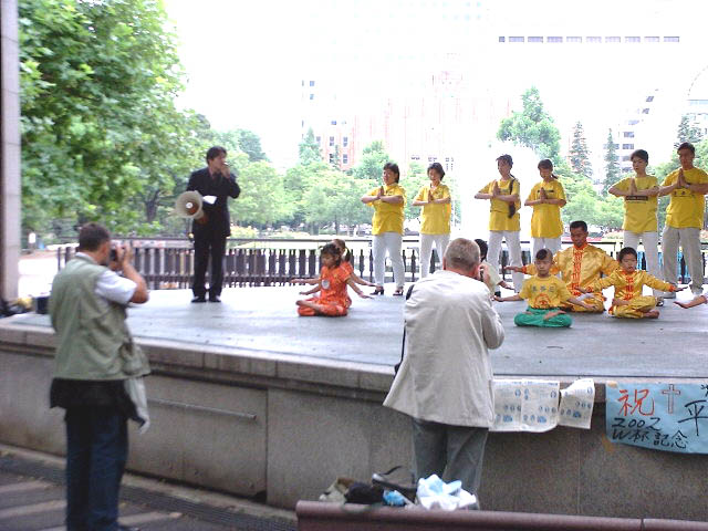 学员们表演了“法轮大法好”,“法正乾坤”等歌舞,展示了法轮功的五套功法,并且表演了中国的民族舞蹈。一位日本学员表演了自己创作的舞蹈,甚为感人。整场演出获得了在场观众的好评。两位德国游客兴致勃勃地拍摄了功法表演场面,当学员将英文大法资料送给他们时,他们连连说,在德国就看过了大法介绍,当最后“法正乾坤”演完后,在观众要求下,又演唱一遍才结束。