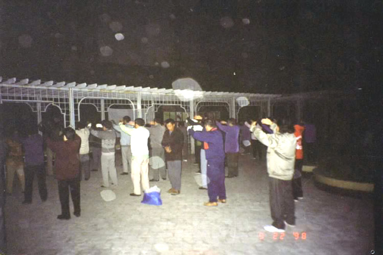 1998年9月22日哈尔滨市太平区、和平小区(花园)炼功点晨炼时拍摄南京市,一个大法弟子放上海晨炼洪法录相时从电视上拍摄的南京市市政府门前炼功点,晨炼时拍摄。(1999年3月5日5:30分拍)