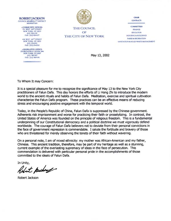 向纽约市法轮大法修炼者宣布认可5月13日的重要意义是我特别的荣幸。这一天是为了庆祝李洪志先生为把法轮大法这一古老的功法和法理传给现代社会所付出的努力。打坐、炼功和精神修炼是法轮大法的特点。这些活动可有效地减少压力并对现代社会产生积极作用。