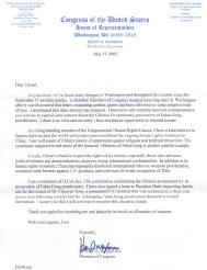 我是国会第218号决议案的共同发起人,该项决议谴责中国政府对法轮功修炼者的迫害。同时我也签署了一封致布什总统的信,请布什总统要求中国释放美国永久居民滕春燕医师,她因以录像揭露法轮功修炼者被强行关押在精神病院之事而受到秘密审判并被判三年监禁。请相信,我将继续密切地关注此状况。