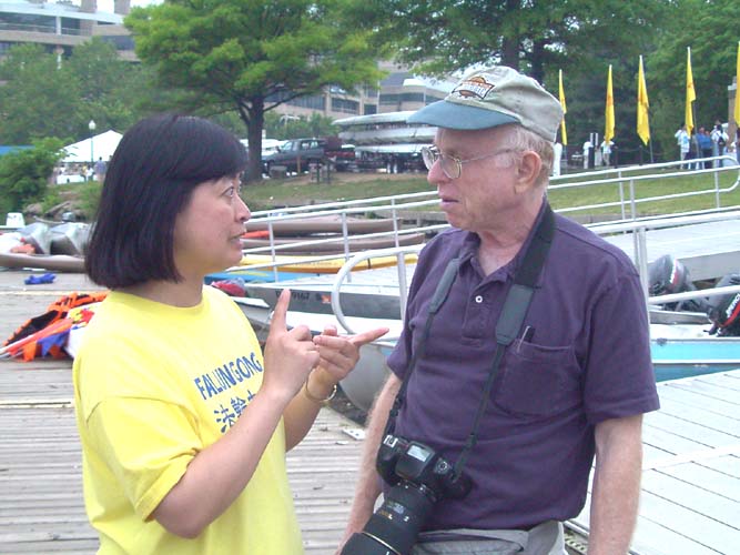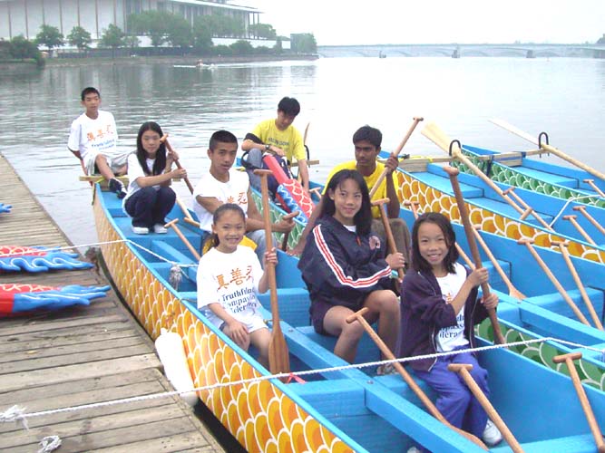 【明慧网2002年6月5日】5月25、26日,华盛顿DC法轮功学员参加了在华府波多马克河上举行的龙舟赛。有8个专业队和37个业余队参赛,加上各队拉拉队,共数千人齐聚波多马克河。