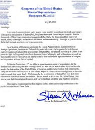 作为国会众议院外交事务岁出委员会的一员,我完全理解法轮大法修炼者,特别是中国的法轮大法修炼者所面临的迫害和对信仰自由这一基本人权的挑战。我非常自豪地在美国国会为所有的人力争基本人权,并将继续努力,以使法轮大法修炼者能勿需担心受到报复,自由行使他们不可剥夺的信仰自由和言论自由的权利。